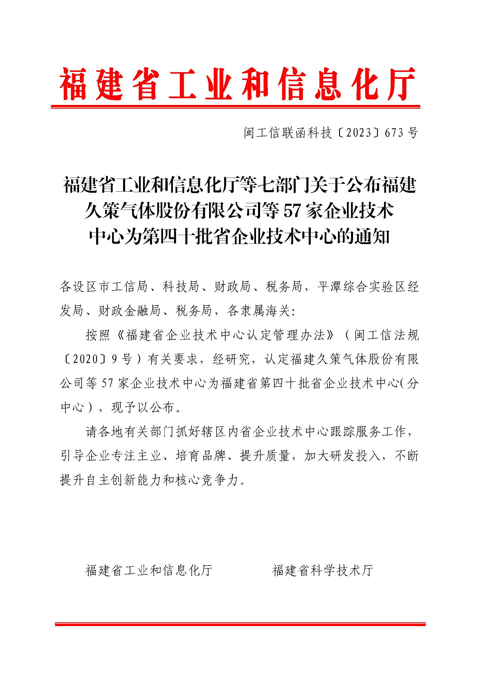 福建省工業(yè)和信息化廳等七部門關于公布福建久策氣體股份有限公司等57家企業(yè)技術中心為第四十批省企業(yè)技術中心的通知